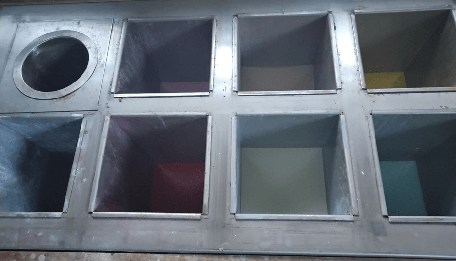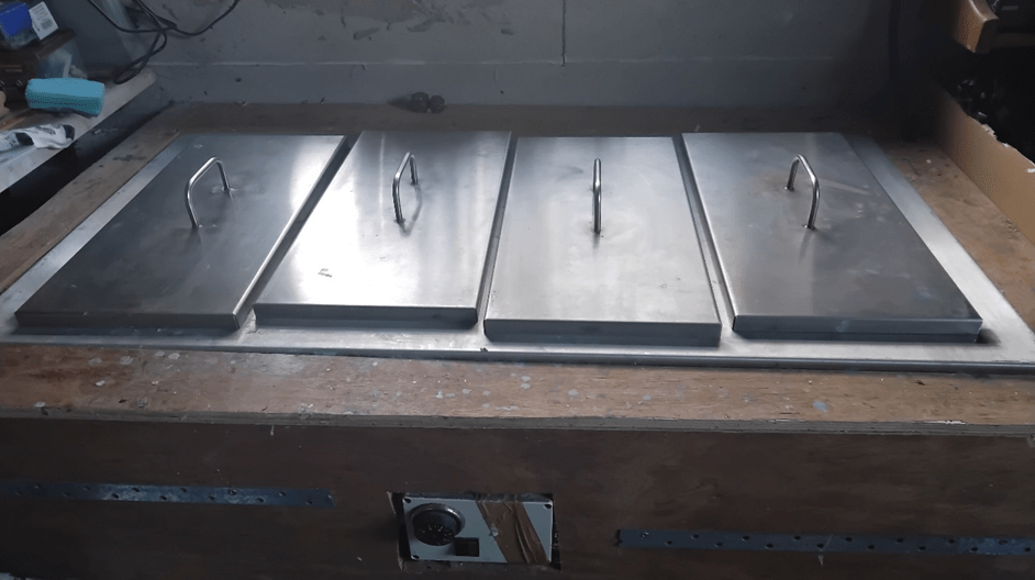 Heating tank to accommodate 8 pots for melting different colour waxes. Tank is 110cm length x 60cm width x 60 cm height electrically heated and temperature controlled 0-100 degrees Celsius..